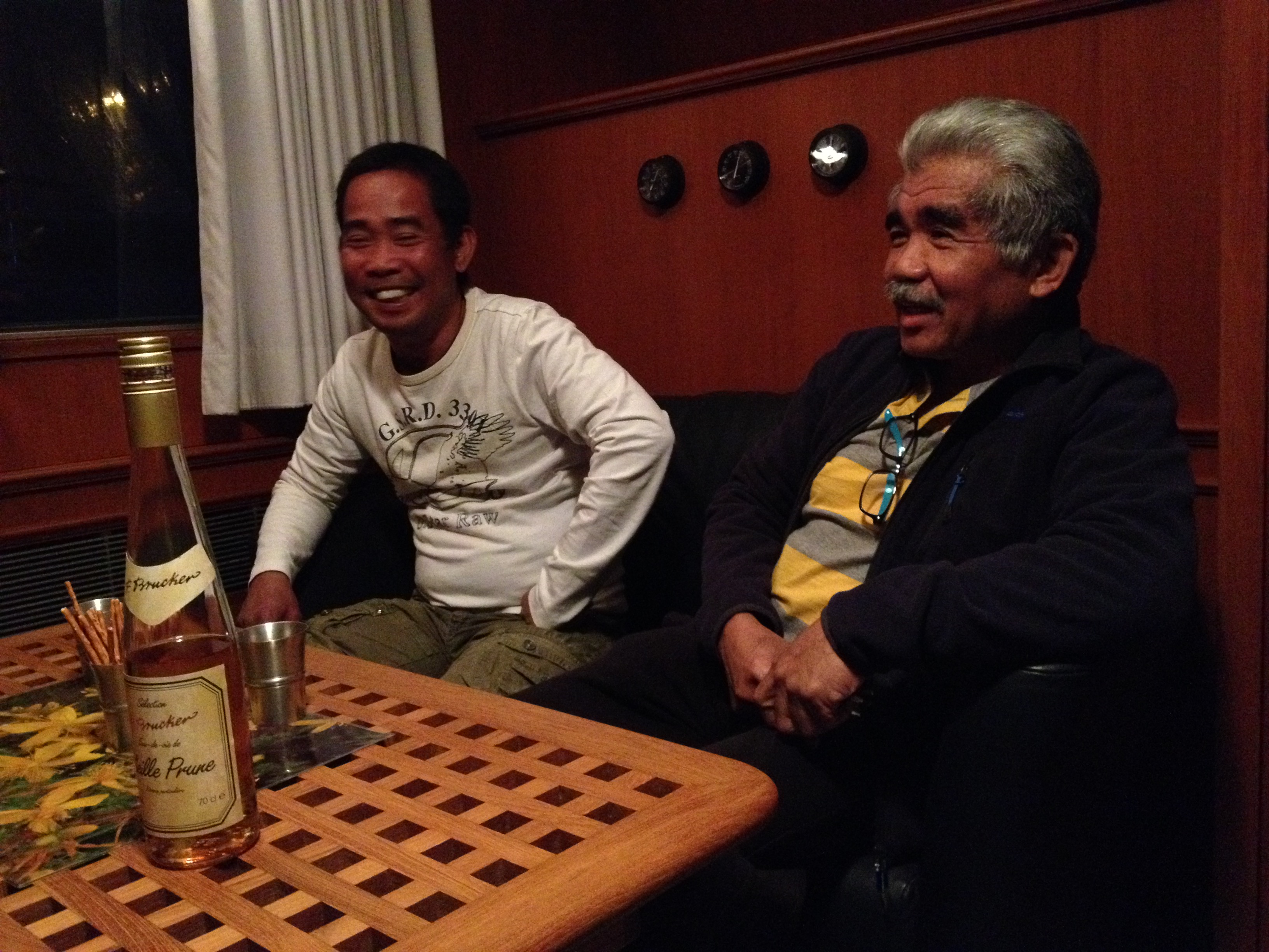 Der Motorenspezialist hat sich zwischen 16 und 18 Uhr angekündigt. Um 18.15 Uhr haben wir Hunger und beschliessen, Moses, die gute Seele, der uns mit den beiden Kapitänen zusammen gebracht und auch auf unserem Schiff gearbeitet hat, über den Ausblieb des Motoreningenieurs (auch ein Philippino, der 91 Schiffe, die auf der ganzen Welt im Einsatz sind betreut) zu informieren und laden ihn zum Nachtessen ein. Nach dem Essen kommt der Ingenieur und bis auf die blinkende, steuerbordseitige Motorenkontroll-Lampe erledigt er alles. Für diese Lampe werden wir wohl einen Schiffselektriker benötigen.